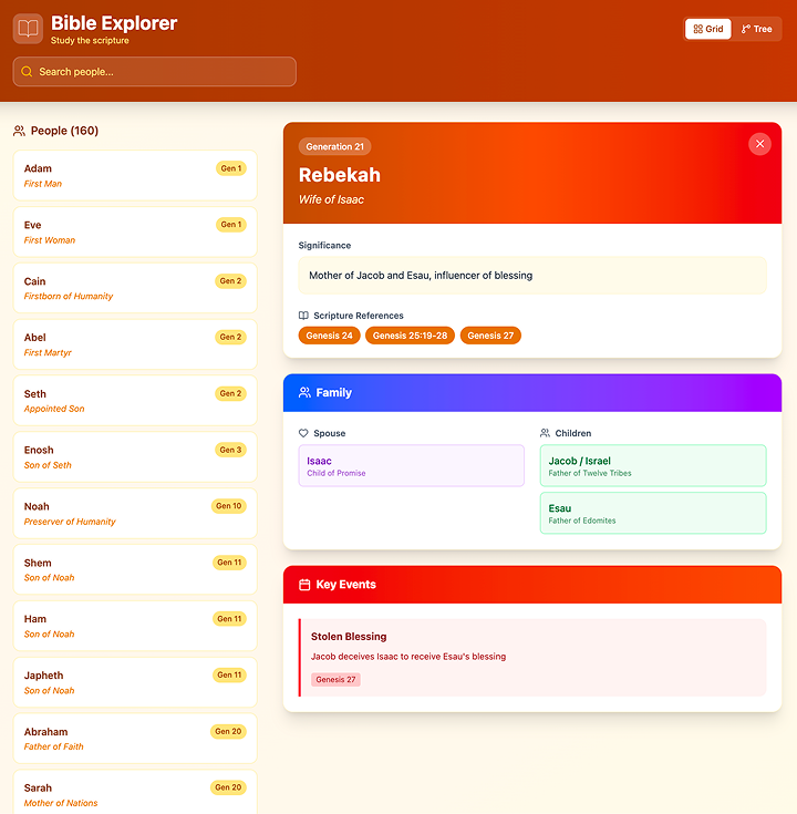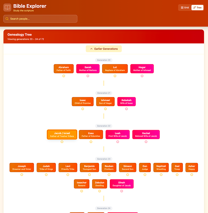 Bible Explorer is a Bible knowledge graph and search engine designed to help you discover and explore information in a visually intuitive way. It uses advanced natural language processing and machine learning algorithms to create a dynamic, interconnected web of knowledge based on your queries.