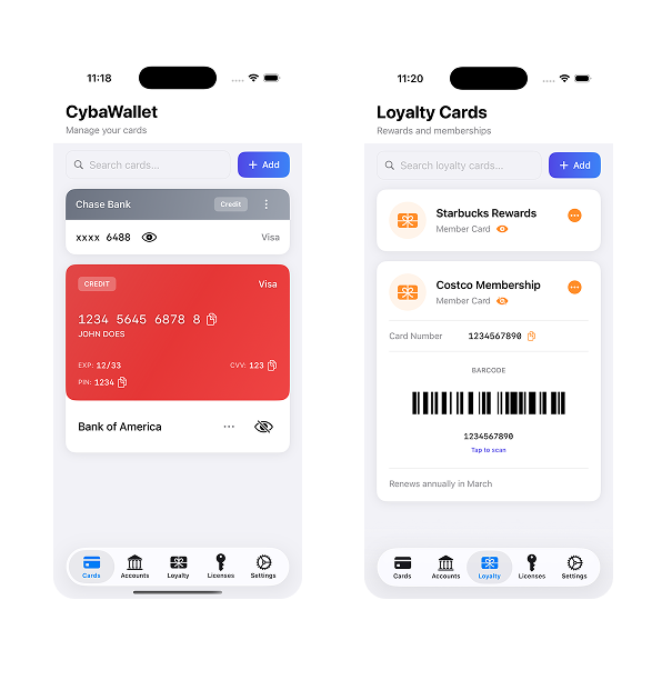 CybaWallet is a secure, offline-first iOS wallet designed to keep your sensitive data safe and organized. Built with privacy and security at its core, the app stores all your data locally in an encrypted database that never leaves your device.
